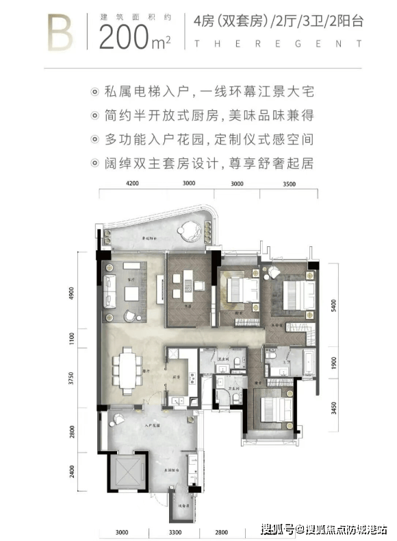 目前南天名苑在售主力产品为珑岸叠墅与天启大平层两类。珑岸叠墅容积率低至0.99,面积区间为280至437平方米,采用私家电梯入户设计,部分户型使用率高达345%,并配备360°U型观景阳台,实现室内外空间的无缝衔接。天启大平层则为140至480平方米的环幕江景现房,专梯专户,270°无遮挡视野直面三江交汇景观。室内装修标准极高,选用劳芬卫浴、大金中央空调等国际一线品牌,细节考究。项目由梁志天操刀室内设计,园林则由美国AECOM团队打造,弧形玻璃幕墙工艺复杂、造价高昂,整体呈现出兼具东方意境与现代美学的居住体验。